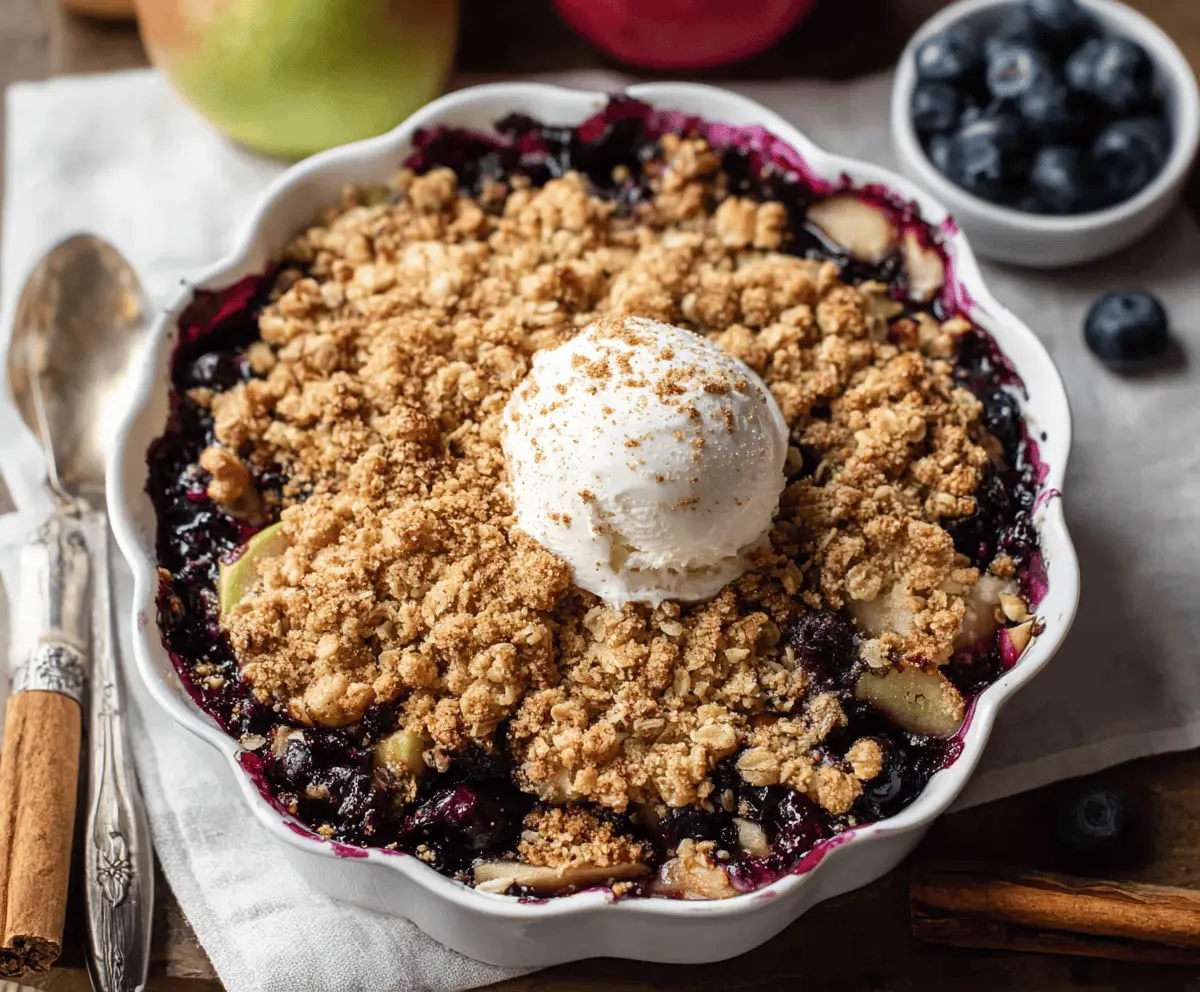 Delicious homemade apple blueberry crisp topped with golden brown crumble, served with a scoop of vanilla ice cream