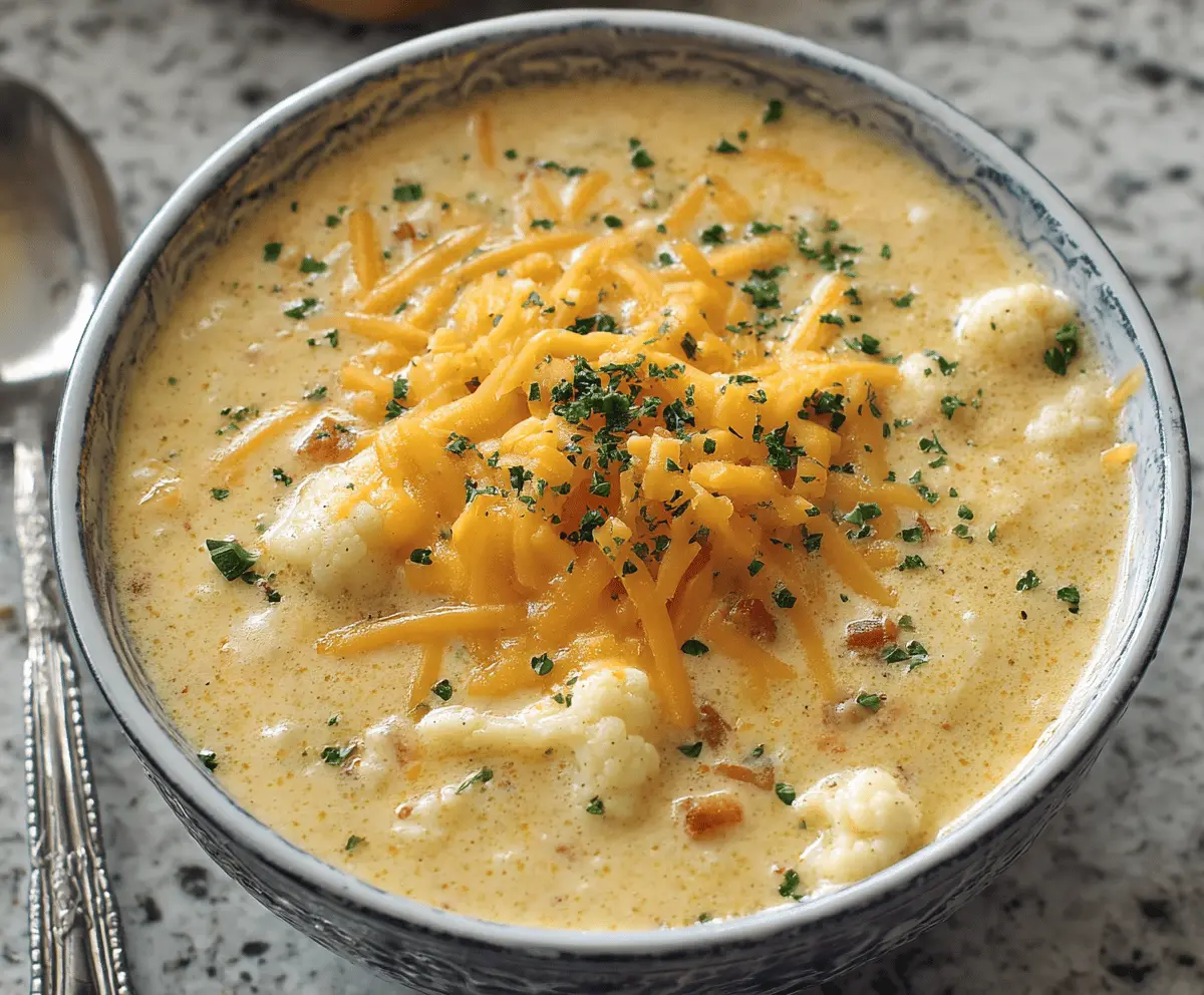 This Cheddar Cauliflower Soup is creamy, cheesy, and oh-so-cozy! With smooth cauliflower blended perfectly with rich cheddar, it’s a bowl of happiness.