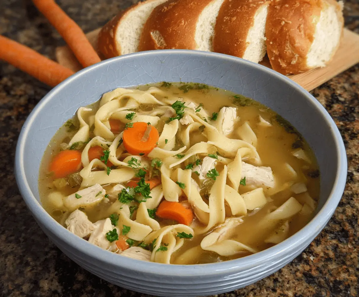 Delicious homemade chicken noodle soup with tender chicken, egg noodles, and fresh vegetables in a savory broth