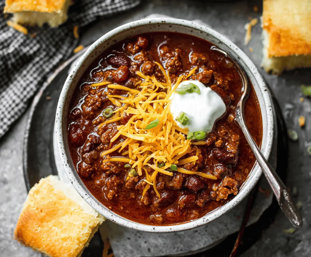 Serve your classic chili hot in bowls topped with a dollop of sour cream, a sprinkle of shredded cheddar cheese, and some chopped green onions or cilantro. Enjoy every comforting bite!