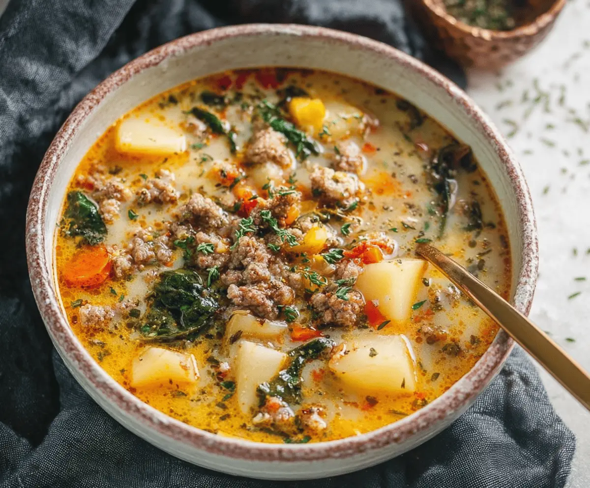 This cozy soup is filled with tasty Italian sausage, hearty potatoes, and flavorful herbs. It’s warm and filling, perfect for chilly days when you need a hug in a bowl!