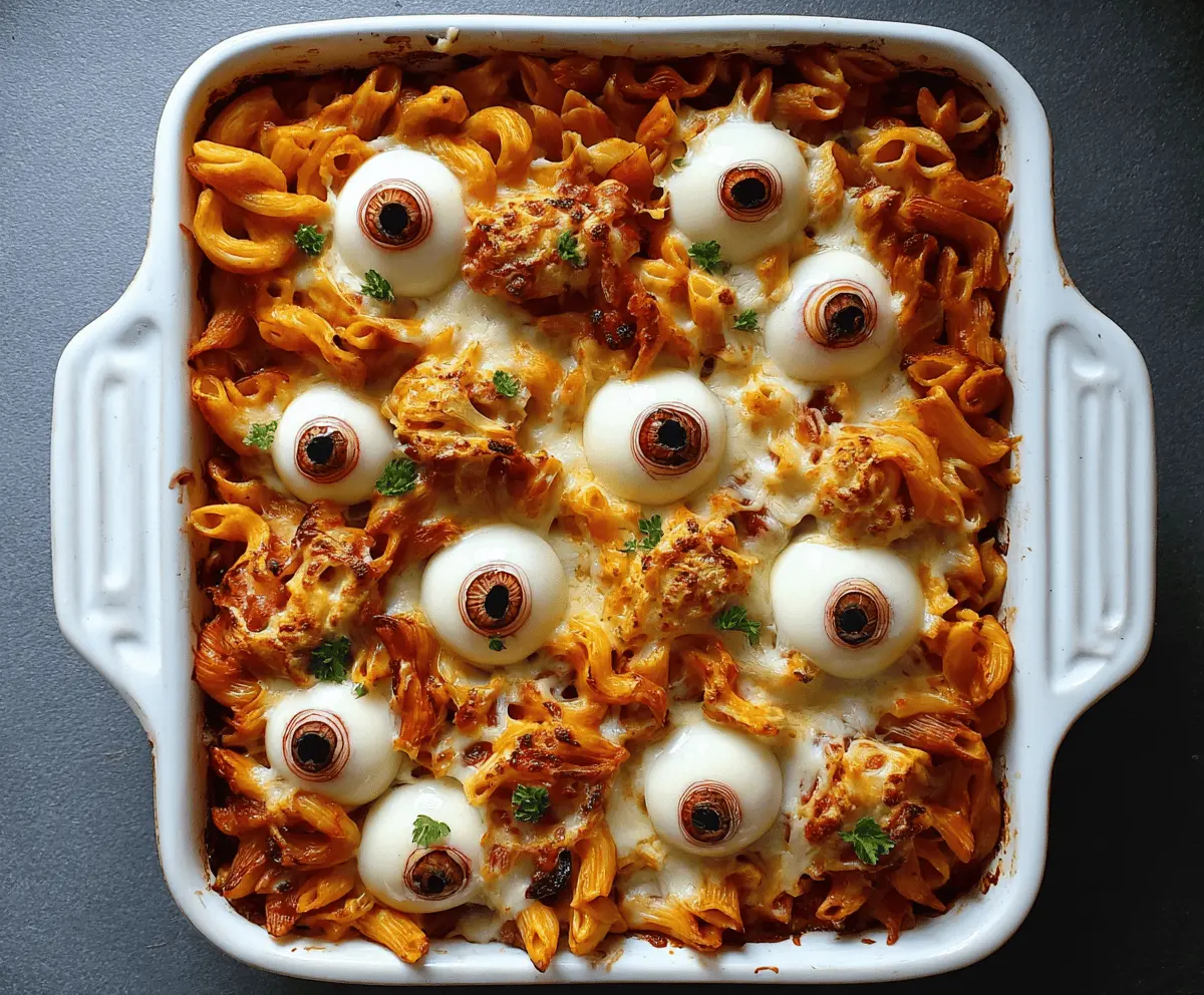 Once it’s done, take it out of the oven and let it rest for about 5 minutes. If you’d like, sprinkle on some chopped parsley or basil for a pop of color. Serve warm and enjoy your spooky Eyeball Pasta Bake!