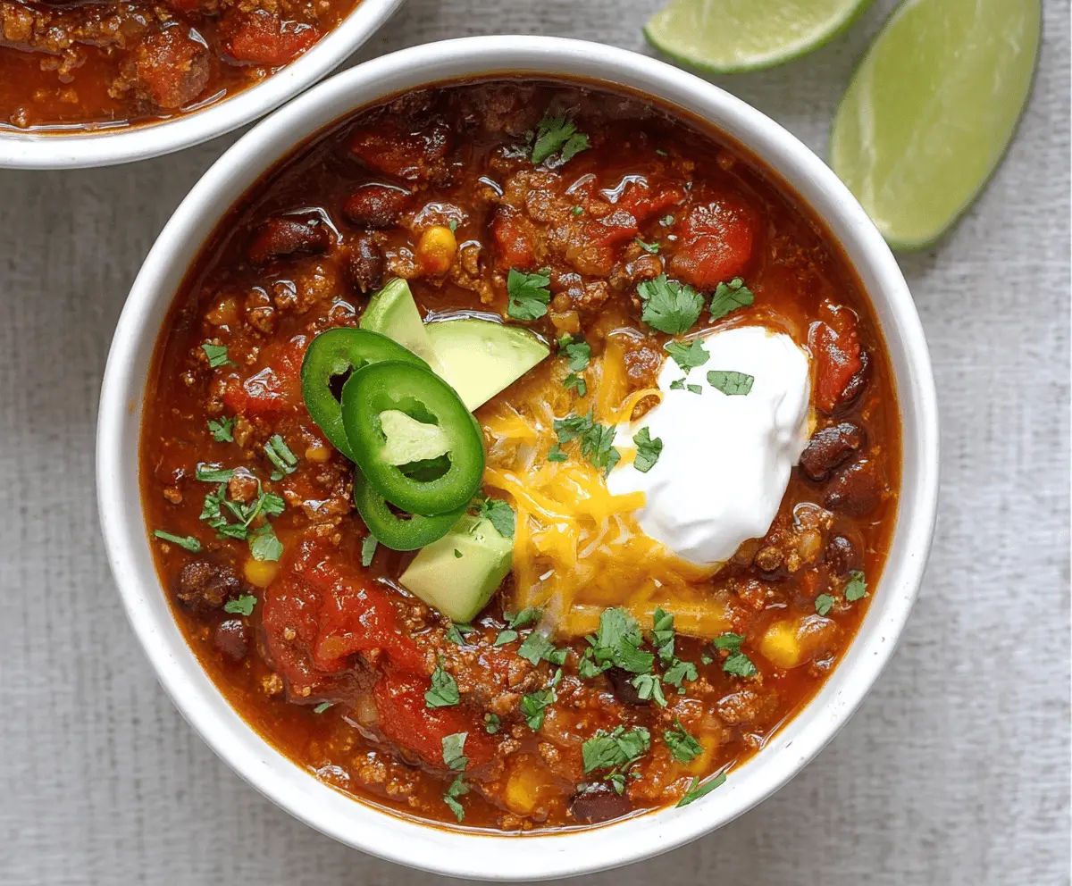Finally, serve your chili hot in bowls. Top with your choice of garnishes like shredded cheddar cheese, a dollop of sour cream, sliced jalapeños, chopped cilantro, and a lime wedge for squeezing over. Enjoy a comforting bowl that’s sure to warm you up!