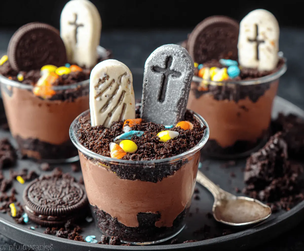 These Graveyard Chocolate Pudding Cups are a fun and spooky treat! Made with rich chocolate pudding, crushed cookie “dirt,” and gummy worms, they are perfect for Halloween parties.