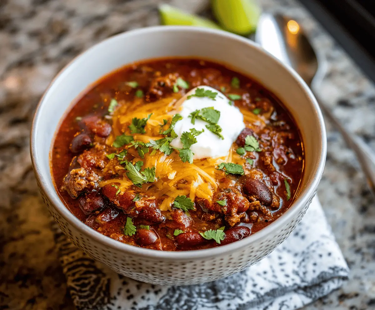 Dish the chili into bowls and adorn with your desired garnishes like a dollop of sour cream, shredded cheddar cheese, fresh cilantro, and a squeeze of lime juice. Enjoy this comforting and hearty meal!