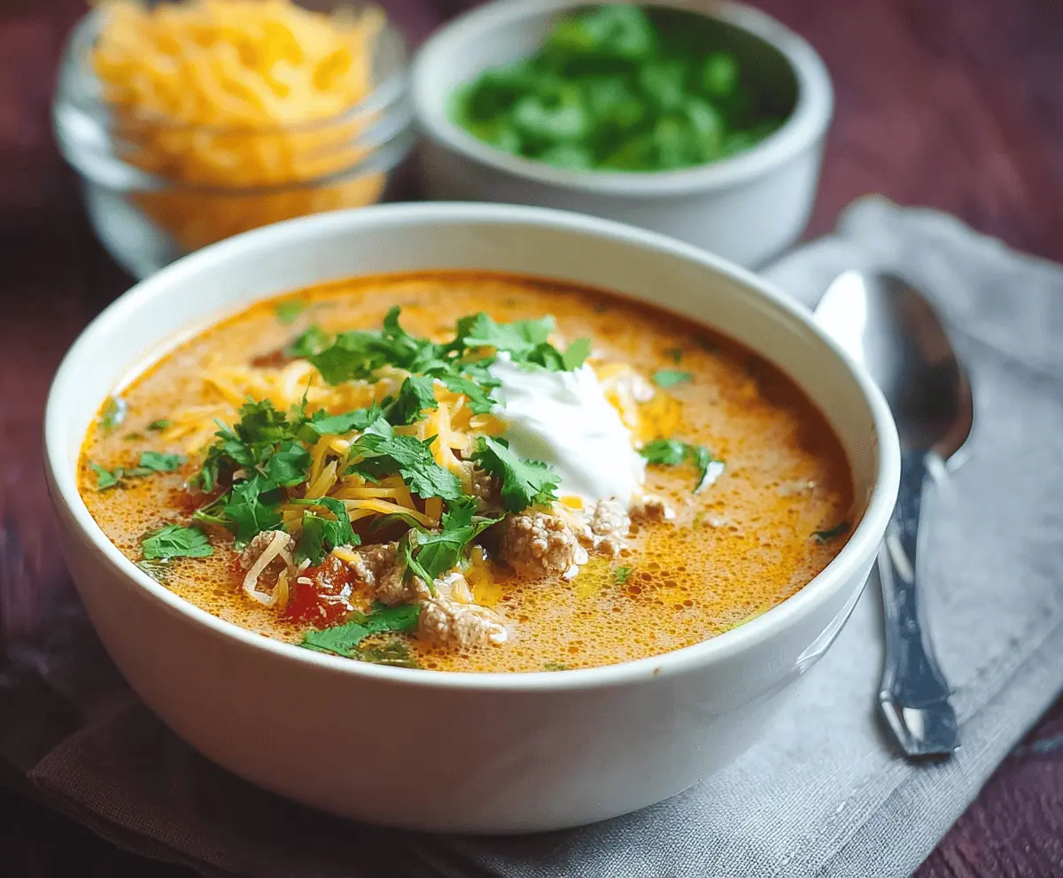 Delicious low-carb taco soup in a bowl with ground meat, tomatoes, peppers, and cheese garnished with fresh herbs