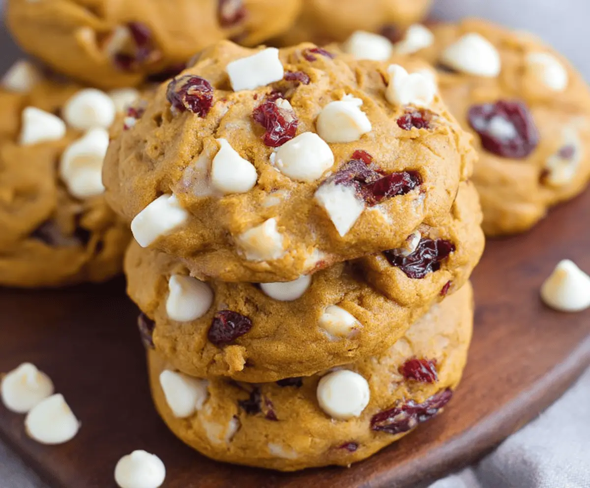 These Pumpkin Cranberry White Chocolate Cookies are soft, chewy, and packed with warm flavors. The mix of pumpkin, sweet cranberries, and creamy white chocolate makes each bite a treat!