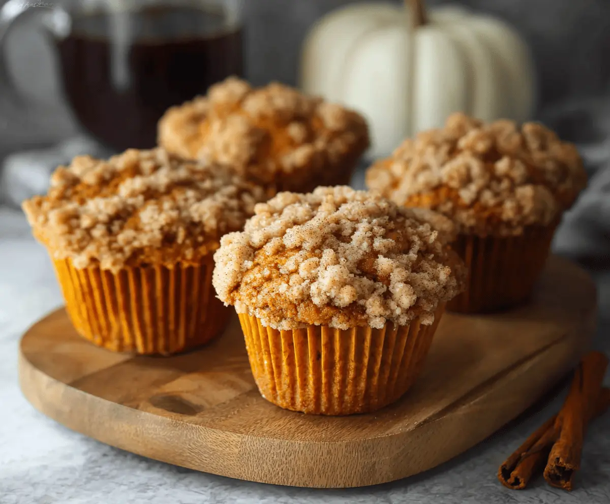 Delicious homemade pumpkin streusel muffins with golden crust and sweet crumb topping on a rustic baking tray, perfect for fall breakfast or snack.