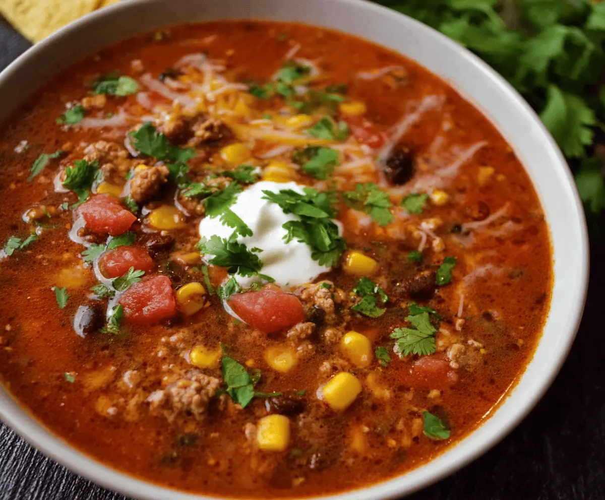 Enjoy this hearty, spicy taco soup for a cozy and satisfying meal!