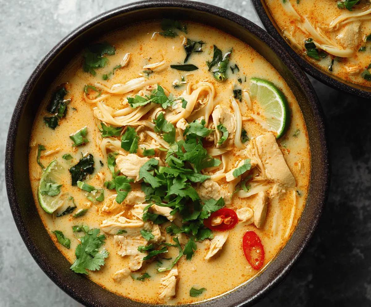 Serve the soup hot in bowls, garnished with sliced red chili peppers, fresh cilantro, or Thai basil, and lime wedges on the side for that zesty squeeze.