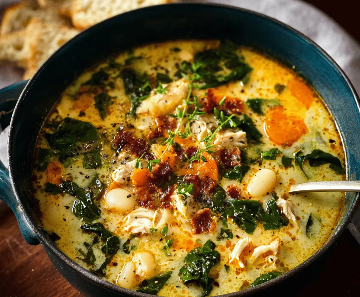 Creamy Tuscan Chicken Soup with tender chicken, spinach, sun-dried tomatoes, and parmesan cheese in a flavorful broth, perfect for a comforting meal.