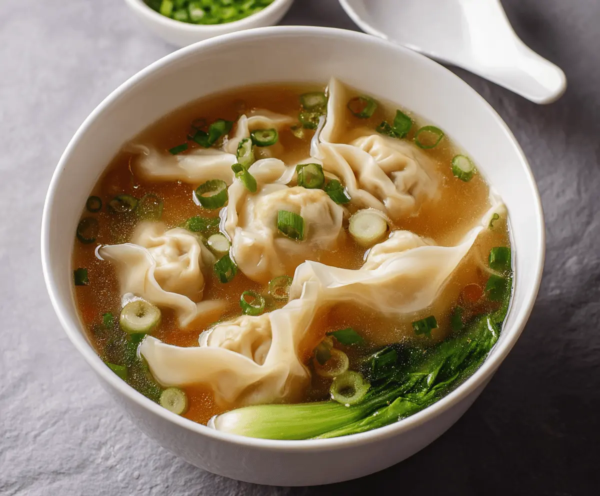 Delicious homemade wonton soup featuring savory wontons, fresh vegetables, and flavorful broth in a white bowl.